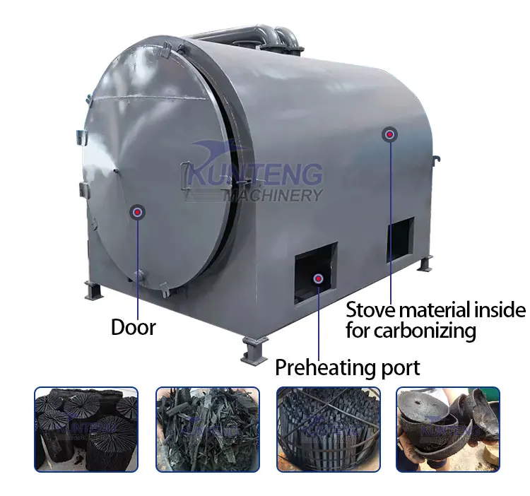 It can use different material as heating source.Such as the waste wood, coal, gas, natural gas, liquefied gas, combustible gas(produced during the carbonized process)
