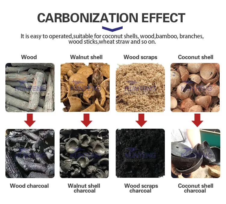 Raw materials of palm shell carbonization furnace, new charcoal stove and charcoal making machine can be coconut shell, wood, biomass, some crops, bamboo, waste wood, branches, trunks, logs, bark, stumps, roots, wooden pallet, sawdust, shavings, wood chips, fruit wood, rice husk, corncob, peanut shell, furfural residue, palm shell, semi-coke and etc.